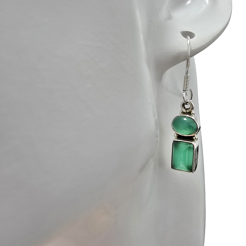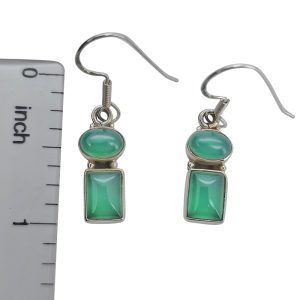 Geometric-Style Green Onyx Dangle Earrings. Oval and rectangle-shaped green onyx stones are set in .925 sterling silver. Dangle earrings on silver hooks.
