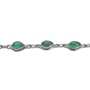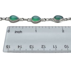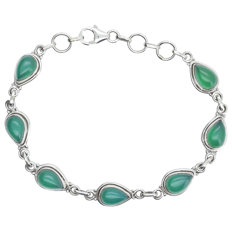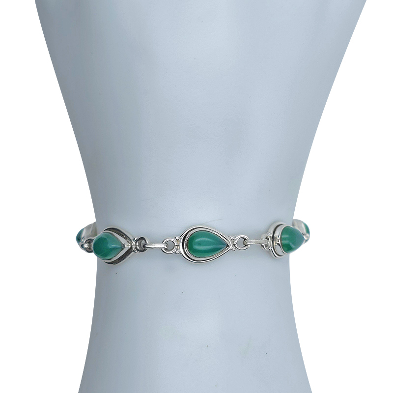 Green Onyx Sterling Silver Link Bracelet. Teardrop-shaped green onyx stones are set in .925 sterling silver. 6″ long bracelet.