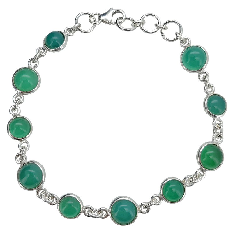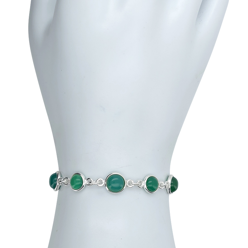 Green Onyx Sterling Silver Link Bracelet. Round-shaped gemstones are set in .925 sterling silver.
