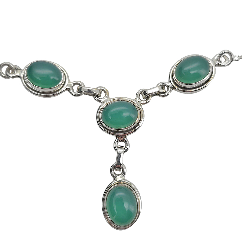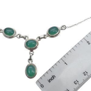 Green Onyx Sterling Silver Necklace. 19″ long with 1.5″ extension. Oval-shaped gemstones set in .925 sterling silver. Gemstone necklace.