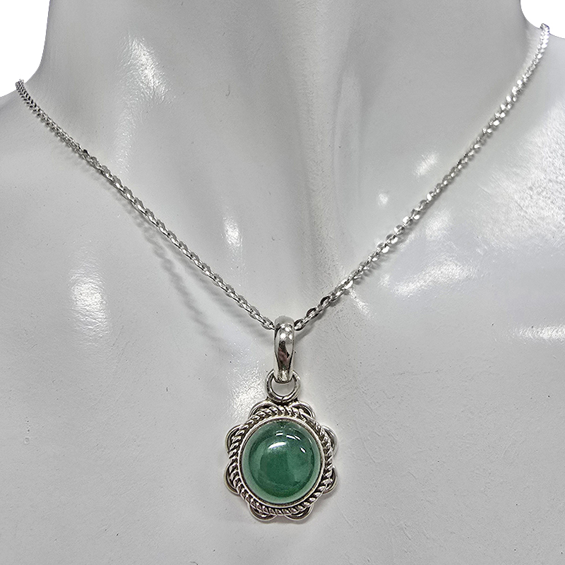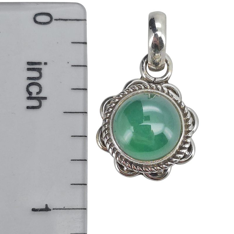 Green onyx sterling silver pendant. The round-shaped green onyx stone is set in .925 sterling silver. Gemstone pendant.
