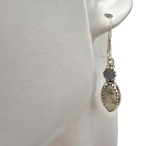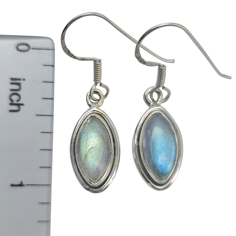 Labradorite Sterling Silver Earrings On Hooks. Marquise and round-shaped gemstones set in .925 sterling silver. Gemstone earrings.