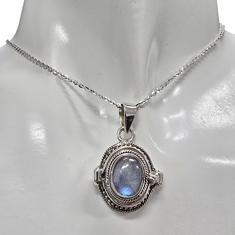 Labradorite Sterling Silver Locket Pendant. Oval-shaped labradorite stone is set in .925 sterling silver. The silver setting functions as a locket (poison box).