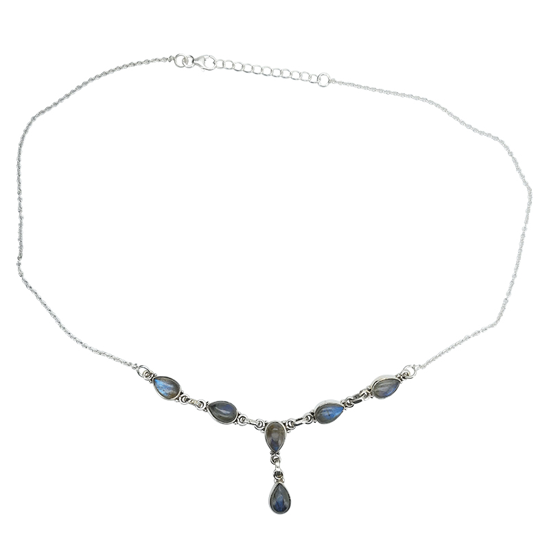 Labradorite Sterling Silver Necklace. Teardrop-shaped gemstones set in .925 sterling silver.