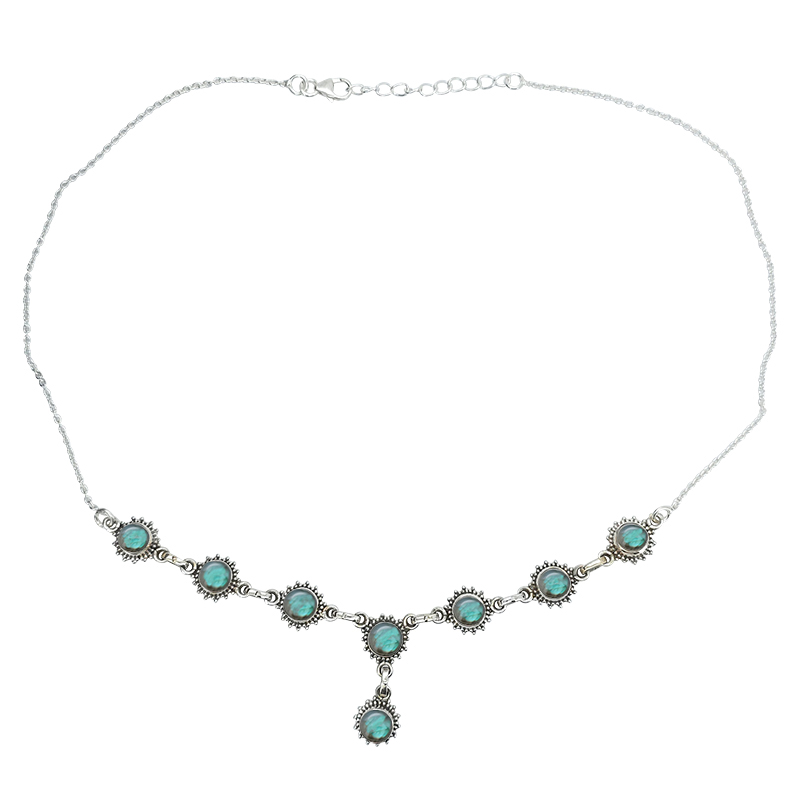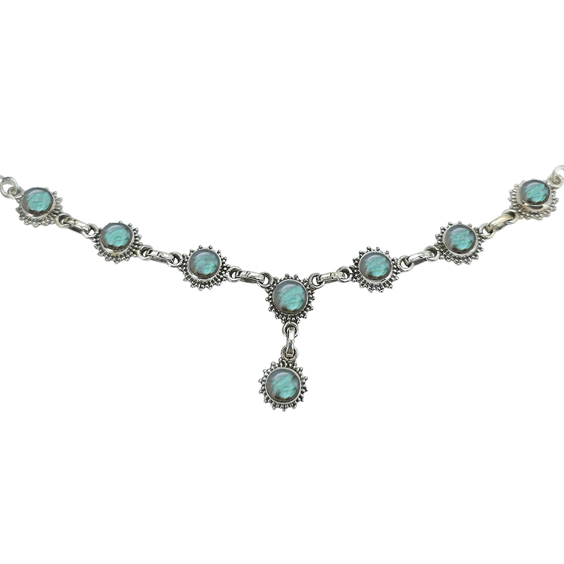 Labradorite Sterling Silver Necklace. Round-shaped gemstones set in .925 sterling silver.