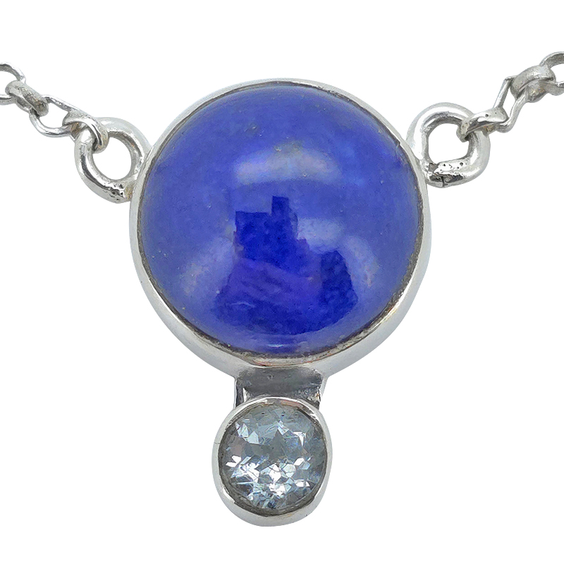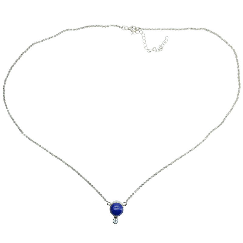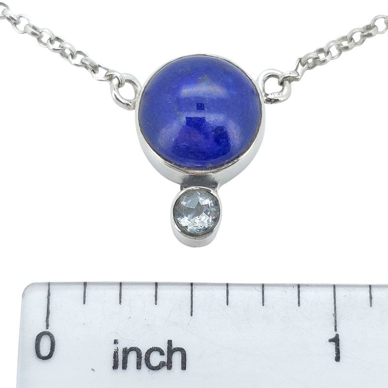 Lapis/Blue Topaz Sterling Silver Necklace 20″. Round-shaped gemstones are set in .925 sterling silver.