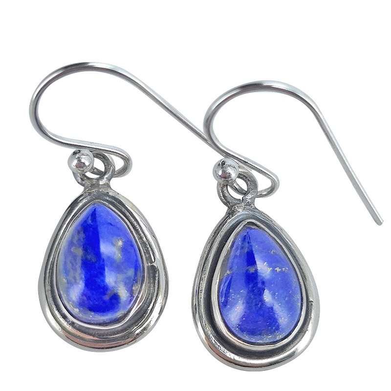 Lapis Sterling Silver Earrings On Hooks. Teardrop-shaped lapis stones are set in .925 sterling silver. Dangle earrings on silver hooks.