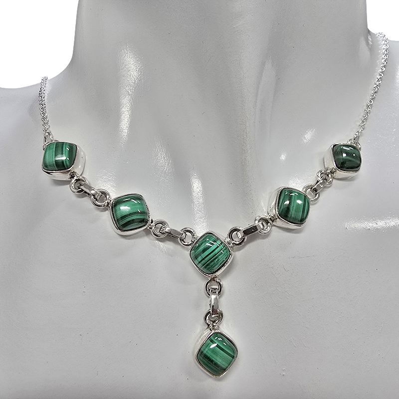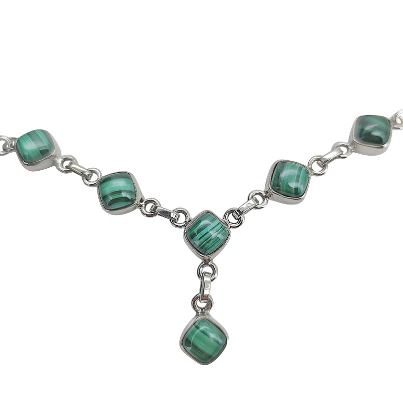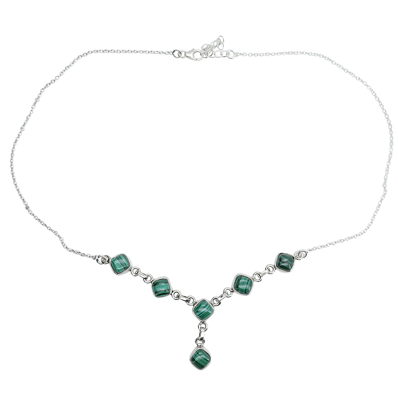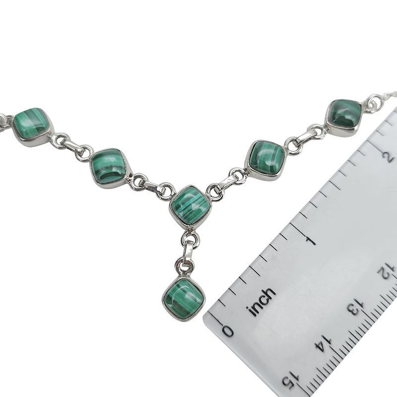 6-Stone Malachite Sterling Silver Necklace 18″. Square-shaped malachite stones are set in .925 sterling silver. The 18″ long necklace has an extension chain.