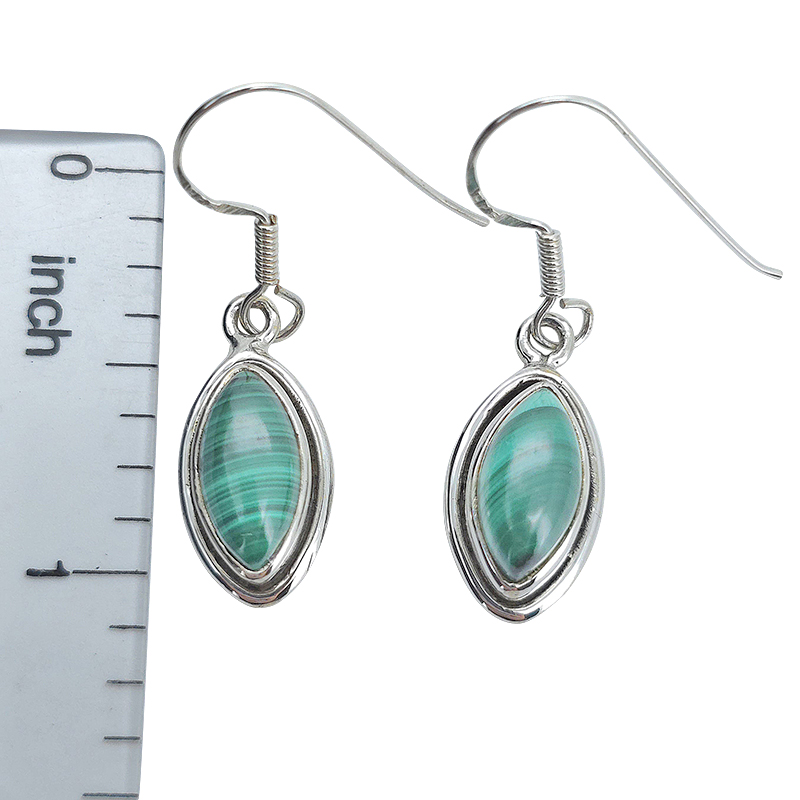 Malachite sterling silver earrings on hooks. Marquise-shaped malachite stones are set in .925 sterling silver. Dangle earrings on silver hooks.