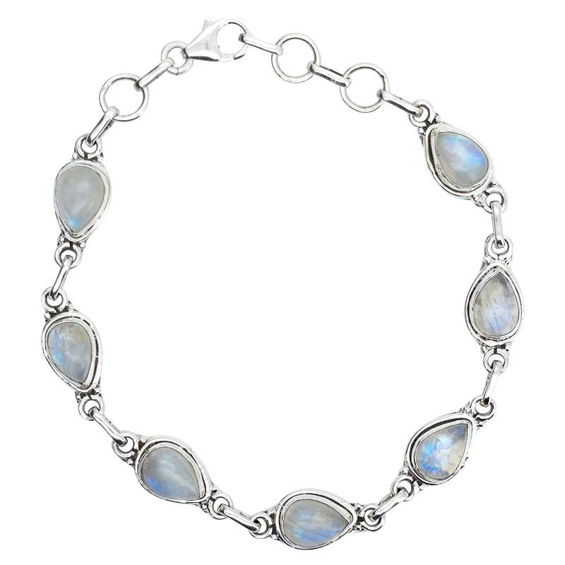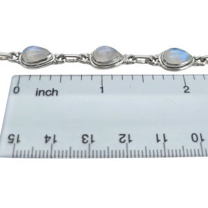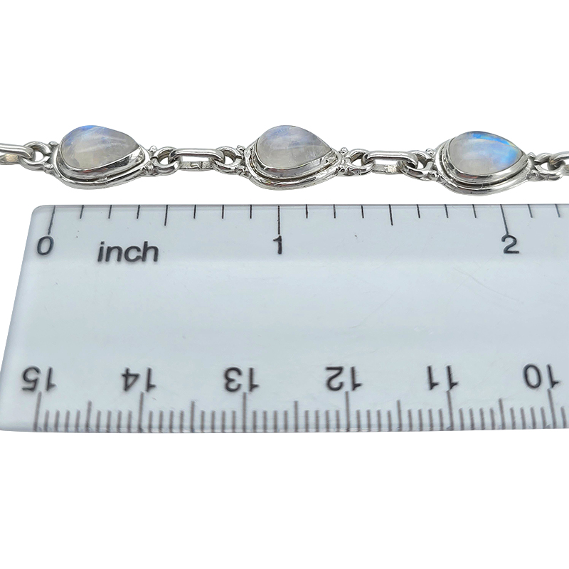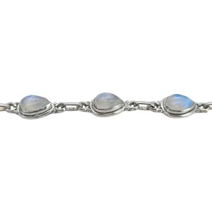Classic Sterling Silver Moonstone Link Bracelet. Teardrop-shaped moonstones are set in .925 sterling silver. 6″ long bracelet.
