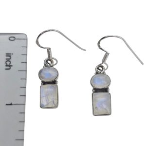 Geometric-Style Moonstone Dangle Earrings. Oval and rectangle-shaped moonstones are set in .925 sterling silver. Dangle earrings on silver hooks.