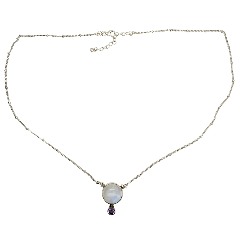 Moonstone/Amethyst Sterling Silver Necklace 20″. Round-shaped gemstones are set in .925 sterling silver.