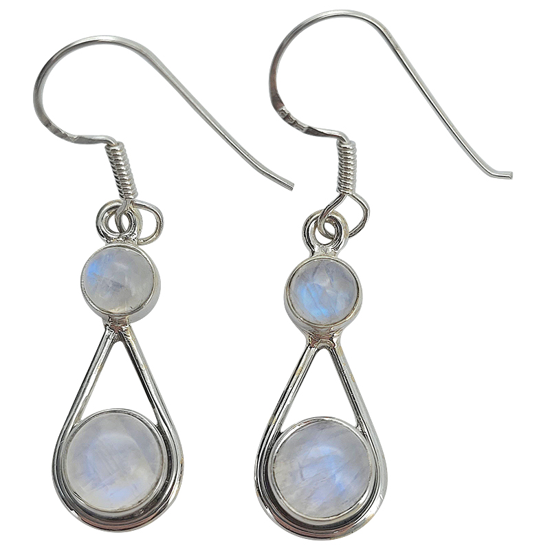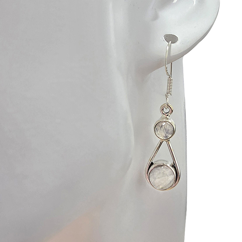 Moonstone Sterling Silver Dangle Earrings. Round-shaped moonstones are set in .925 sterling silver. Dangle earrings on silver hooks.