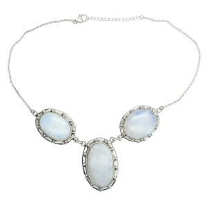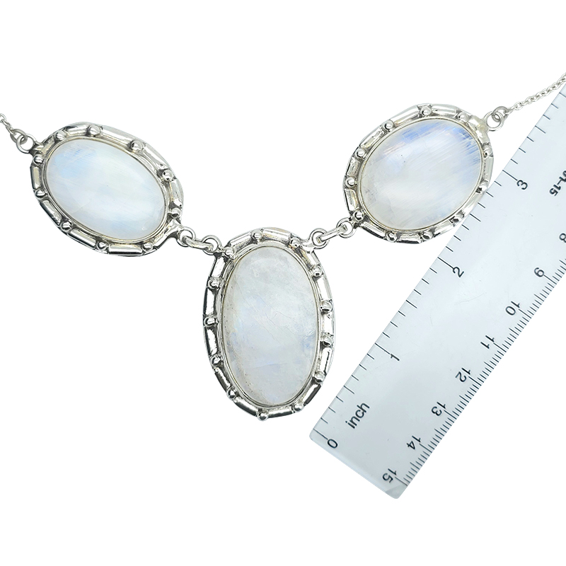 Moonstone Sterling Silver Necklace 18″. Oval-shaped moonstones are set in .925 sterling silver. 18″ long necklace.