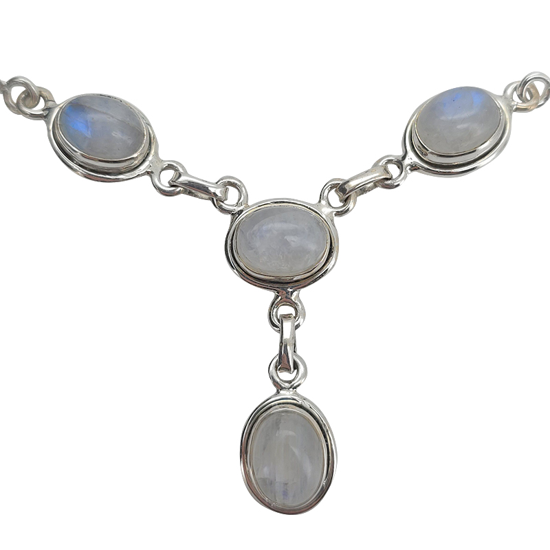 Moonstone Sterling Silver Necklace. Oval-shaped moonstones are set in .925 sterling silver. The necklace is 16″ long and has an extension chain.