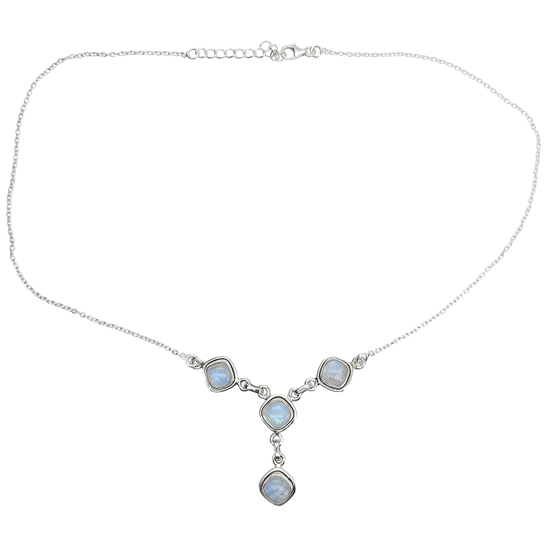Moonstone Sterling Silver Necklace. Square-shaped moonstones are set in .925 sterling silver. The 18″ long necklace has an extension chain.