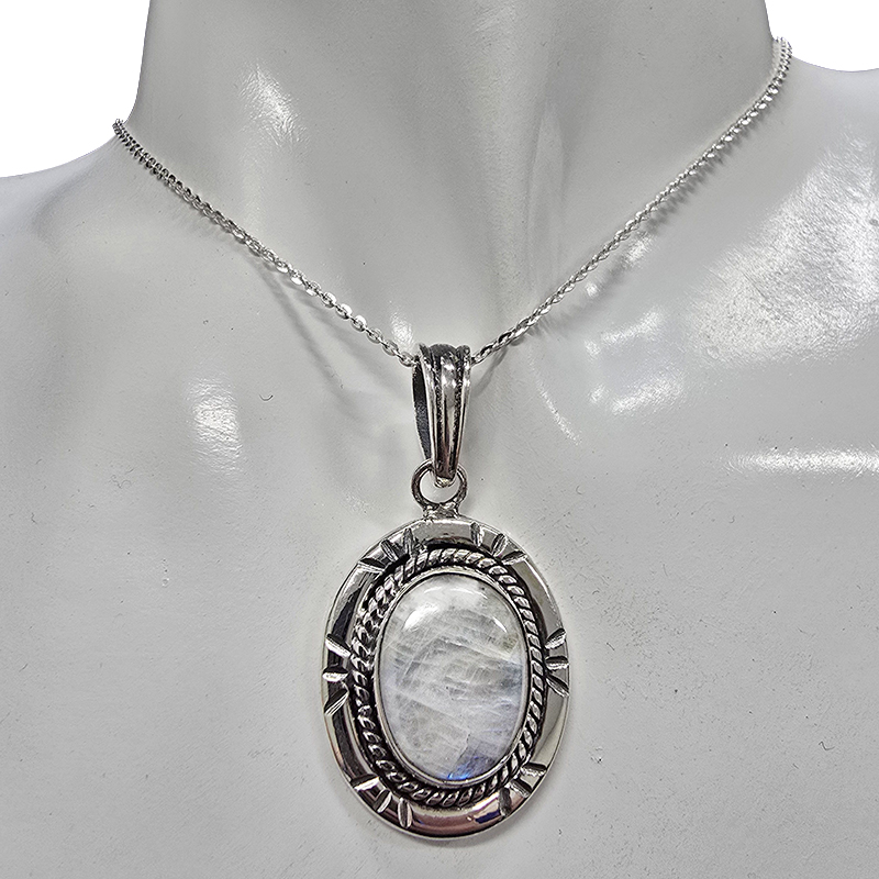 Moonstone Sterling Silver Pendant. Oval-shaped gemstone set in .925 sterling silver. Gemstone pendant.