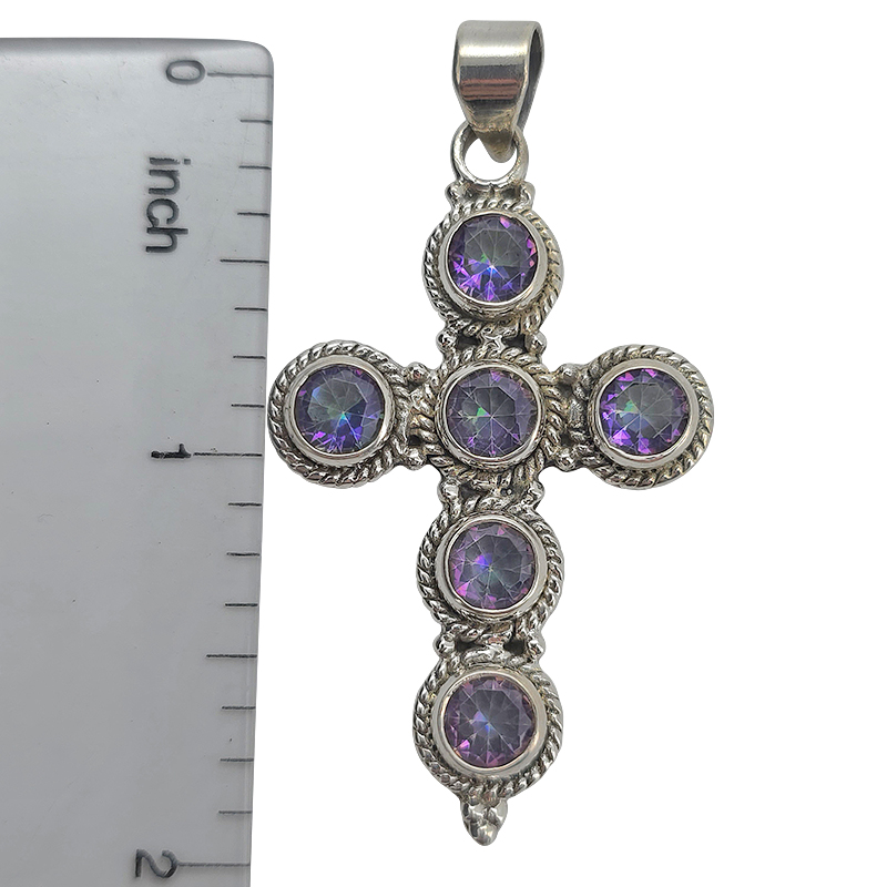 Mystic Sterling Silver Cross Pendant. Round-shaped faceted gemstones are set in .925 sterling silver. Gemstone pendant.