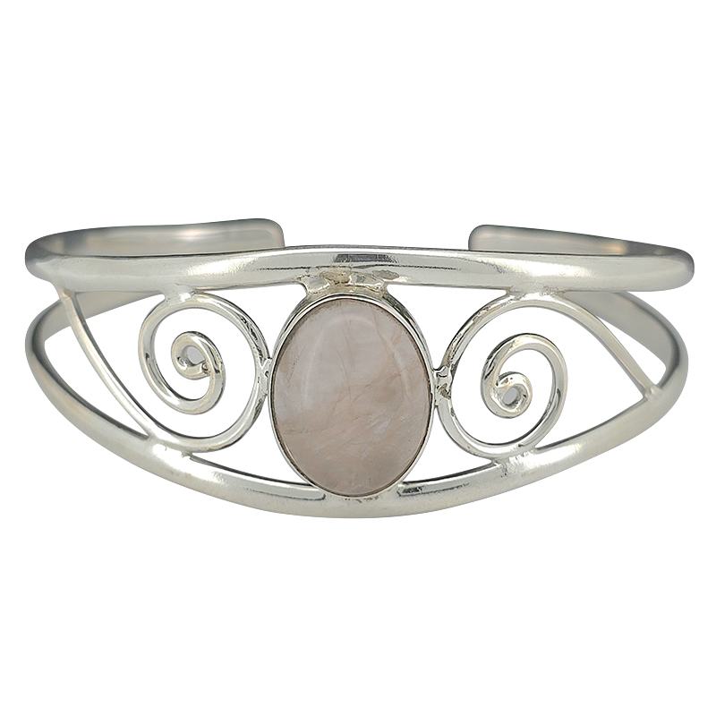 Rose quartz sterling silver cuff bracelet. Oval-shaped rose quartz stone is set in .925 sterling silver. Gemstone bracelet.