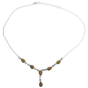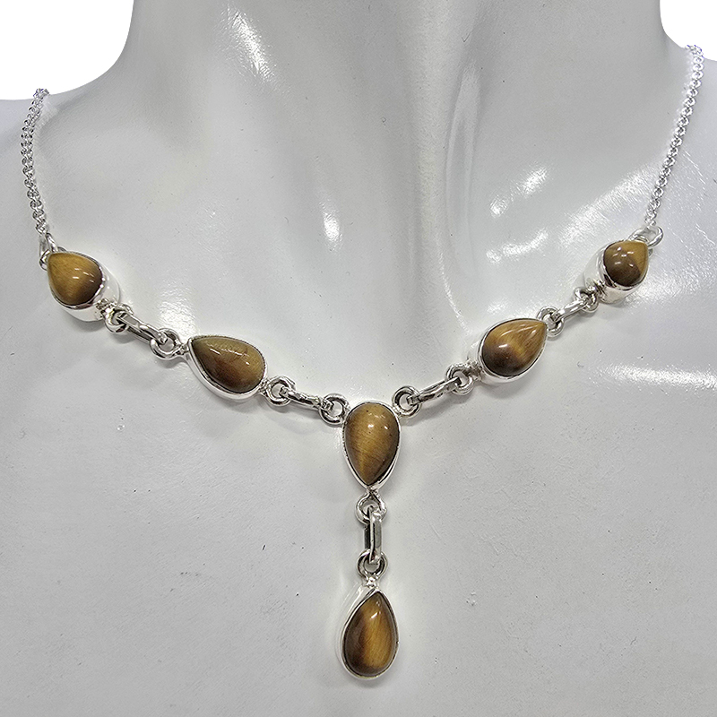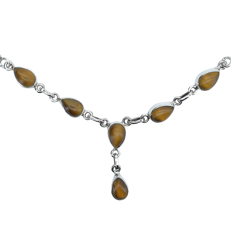 Tiger’s Eye Sterling Silver Necklace 18″. Teardrop-shaped Tiger’s eye stones are set in .925 sterling silver.