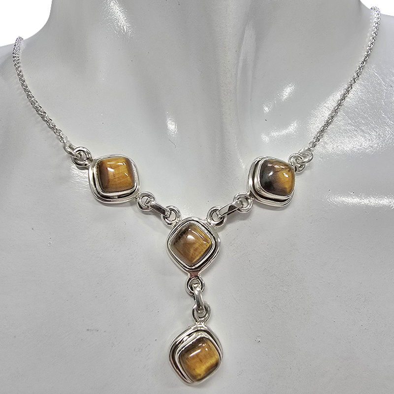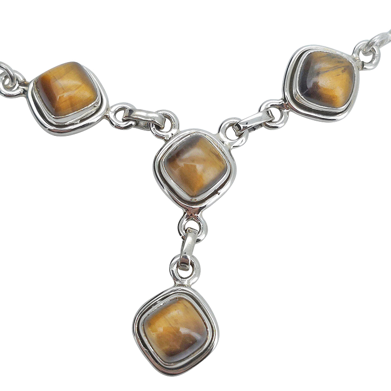 Tiger’s Eye Sterling Silver Necklace. Square-shaped Tiger’s eye stones are set in .925 sterling silver. The 18″ long necklace has an extension chain.