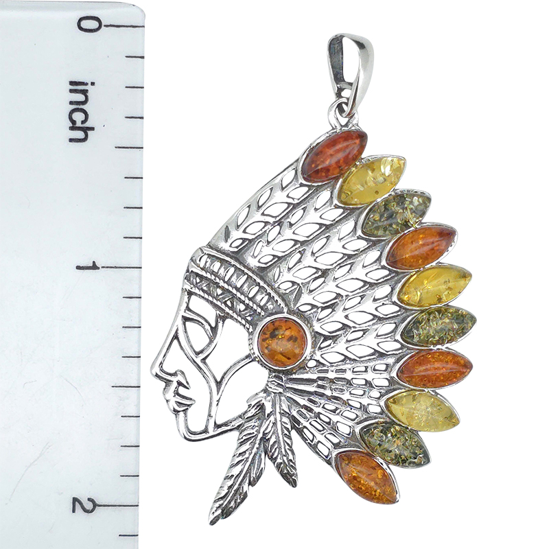 Native American in Feather Headband Amber/Silver Pendant. Multi-color amber stones set in .925 sterling silver. Genuine Baltic amber.