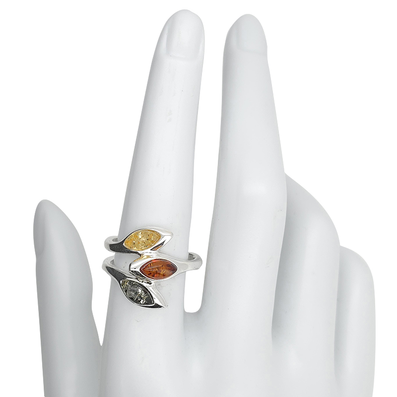 Multi-Color Amber Sterling Silver Ring. Marquise-shaped amber stones set in .925 sterling silver. Genuine Baltic amber.