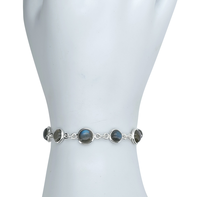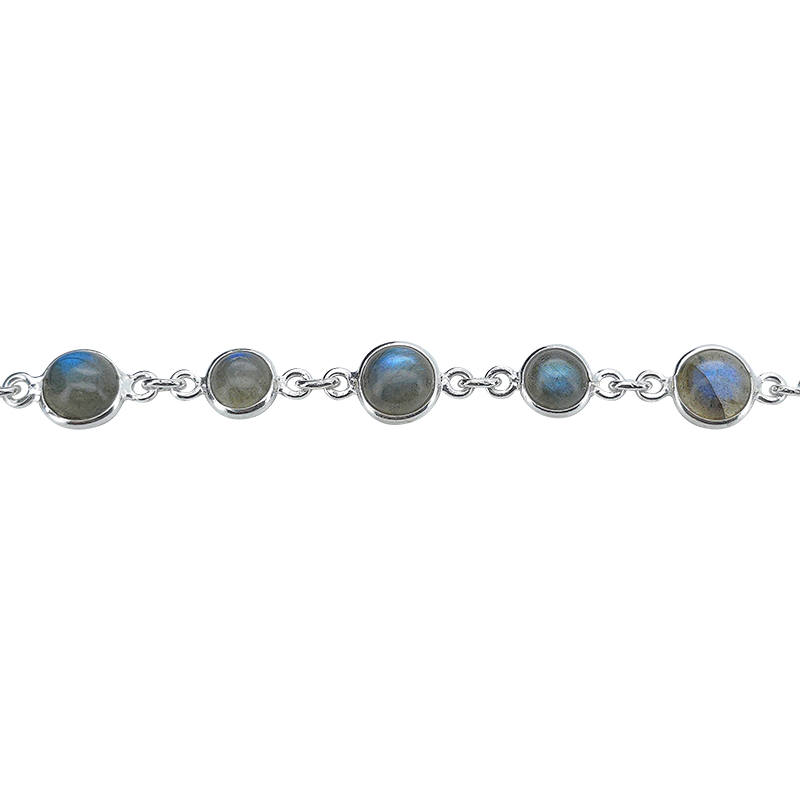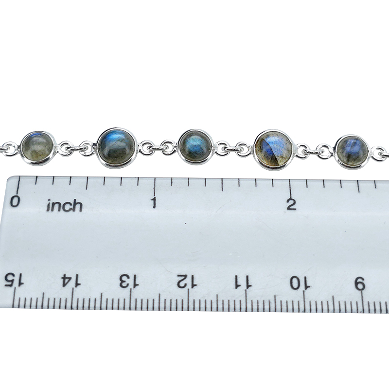 Labradorite Sterling Silver Link Bracelet. Round-shaped gemstones are set in .925 sterling silver.